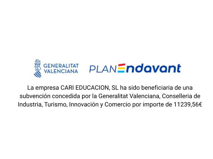 La empresa CARI EDUCACION, SL ha sido beneficiaria de una subvención concedida por la Generalitat Valenciana, Conselleria de Industria, Turismo, Innovación y Comercio por importe de 11239,56€